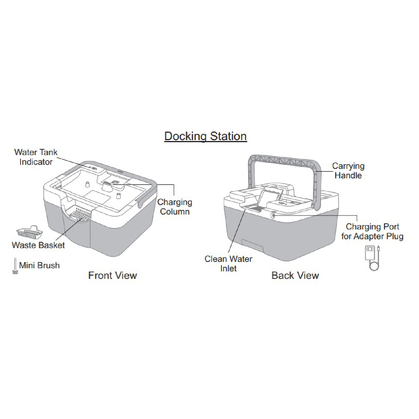 No water or very little water comes out | • Check if the Powerhead is placed on the Docking Station properly. • Check if the Indicator for the clean water tank is on. • Check if the clean water tank is empty or the waste water tank is full. • Check if the clean water filter is blocked. • Open the Powerhead Cover and check if the clean water outlet is blocked. • Check if the charging connector below the Powerhead and the charging column on the Docking Station has water residue or is covered by a foreign object. |