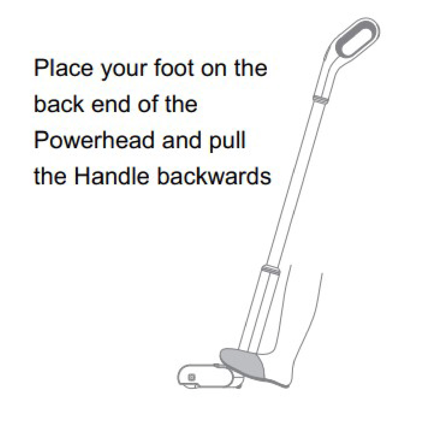 Remove the SweepMOP (with the Roller installed in it) from the Docking Station. The Handle is normally in the standing upright position. Gently place your foot on the back end of the Powerhead and pull the Handle backward, which allows you to operate the mop easily. You will hear a click, which is the release sound of the lock. Press the top orange button on the Handle to power on. You are now ready to use your SweepMOP. Simply push to sweep and pull to mop.