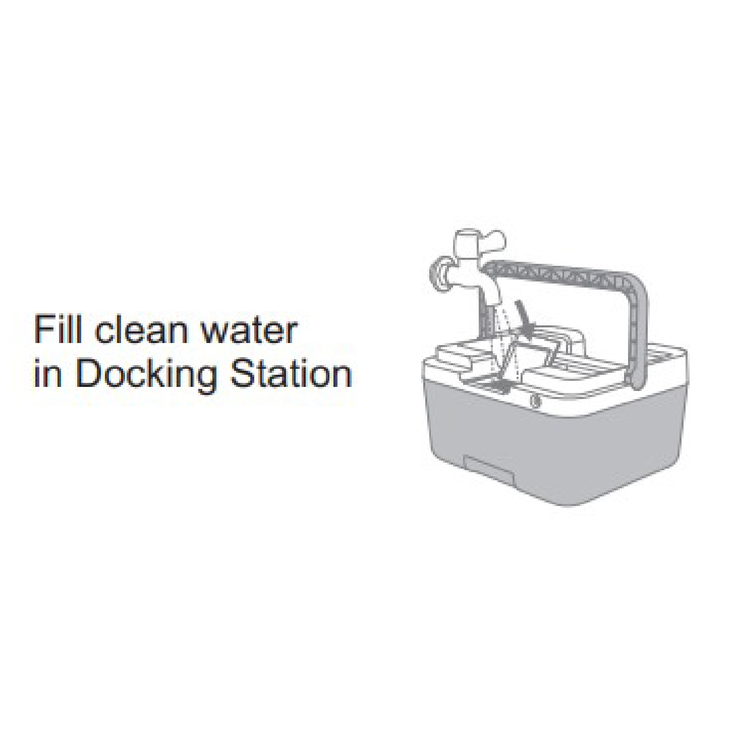 • First, add about a gallon of clean water to the Docking Station clean water tank through the water inlet opening on top (raise Docking Station Carrying Handle to access the opening flap).