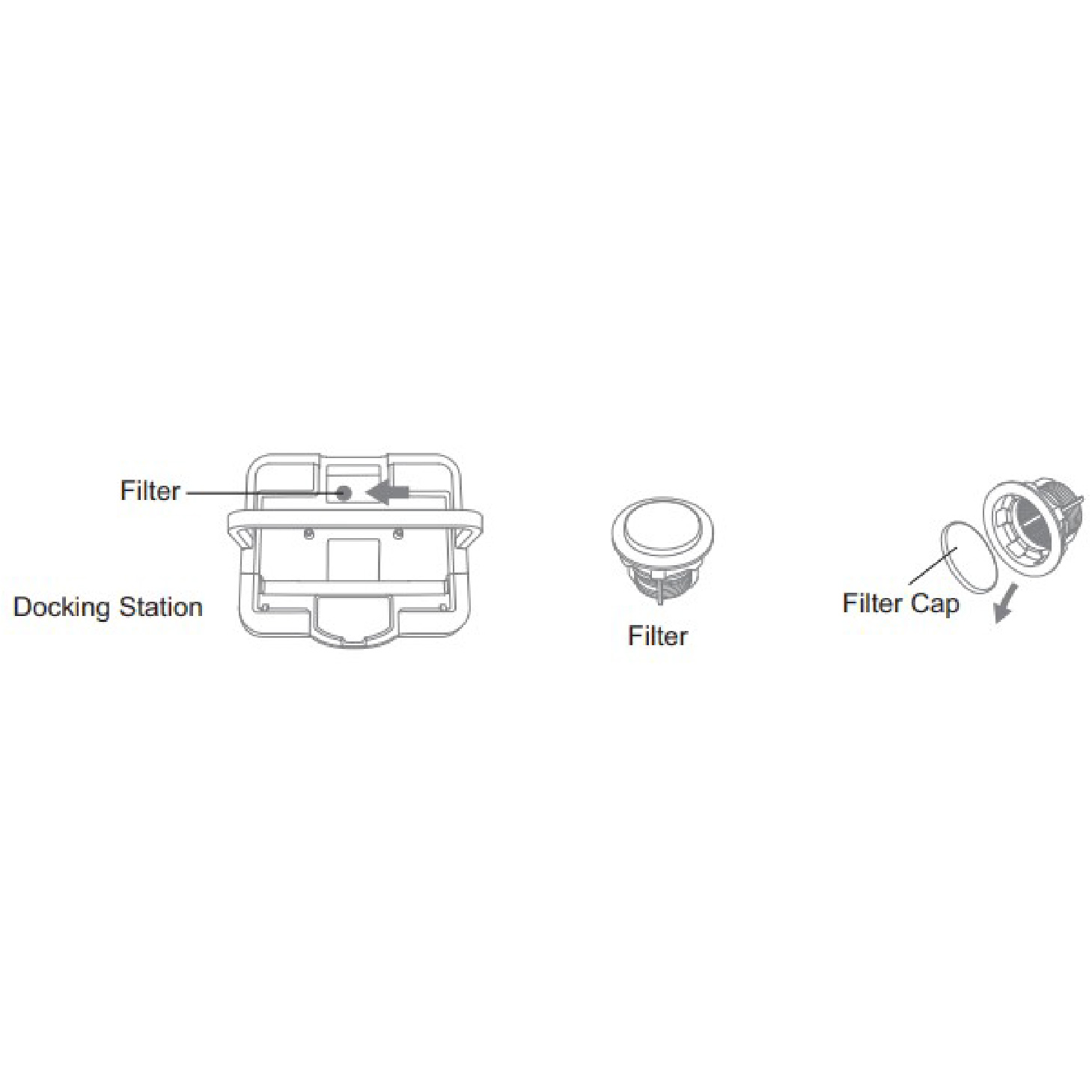 To prevent blockage, regularly clean the clean water Filter which is at the base of the Docking Station. Pull out the small round Filter, open the Filter Cap and clear the inside of the Filter. Then close the Filter Cap and replace it by pushing the filter back into the base of the Docking Station.